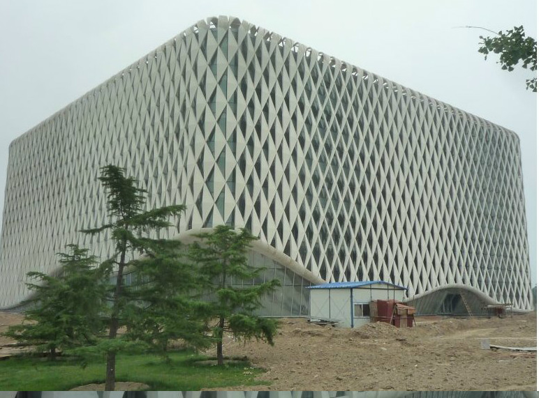 建筑的上部立面采用了雙層表皮,玻璃幕墻之外以菱形交匯的GRC網(wǎng)格包覆,使建筑猶如一件鏤空的藏寶盒,朦朧而婉約,菱形網(wǎng)格的圖案又抽象地對(duì)傳統(tǒng)建筑漏窗進(jìn)行了現(xiàn)代詮釋。在連續(xù)均質(zhì)統(tǒng)一的菱形網(wǎng)格模數(shù)之中,根據(jù)不同朝向的日照及遮陽要求,融入中國(guó)傳統(tǒng)五行的抽象圖解,不同的立面變幻出各異的圖案,疏密有致。這些符號(hào)是對(duì)建筑物本身文化背景的闡述,同時(shí)也表達(dá)了信息時(shí)代特有的審美取向。在陽光最強(qiáng)烈的時(shí)候,這層網(wǎng)格就成了屏蔽直射光的有效屏障,而被GRC網(wǎng)格捕捉到的陽光從間隙灑入室內(nèi),斑駁成影。為空間增加了生動(dòng)活潑的氣氛。 新材料的使用為建筑注入了時(shí)代的氣息,更使建筑成為一個(gè)空靈,雅致的當(dāng)代藝術(shù)品。