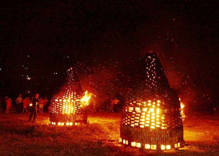 5、燒塔:南方廣泛流傳著燒瓦子燈(或稱燒花塔、燒瓦塔、燒番塔)的游戲。如《中華全國風(fēng)俗志》卷五記:江西“中秋夜,一般孩子于野外拾瓦片,堆成一圓塔形,有多孔。黃昏時(shí)于明月下置木柴塔中燒之。俟瓦片燒紅,再潑以煤油,火上加油,霎時(shí)四野火紅,照耀如晝。