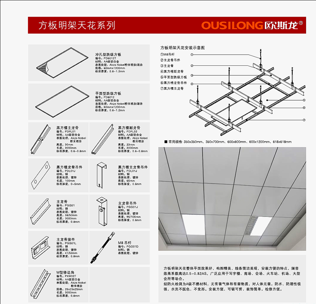 歐斯龍明架方板造型極具現(xiàn)代感,造型簡潔,塑造獨特的立體感,豐富視覺效果。設(shè)計結(jié)構(gòu)結(jié)合使用功能,安裝效果等方面都能達到唯美的平衡,特別是顯露的T字龍骨和黑槽龍骨的使用,更添一分穩(wěn)重和典雅,且裝拆簡易快捷。